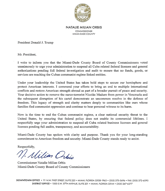 Pero la política por sí sola no es suficiente. La coerción y la aplicación de la ley son lo que hace reales las sanciones. Por eso la resolución exige la suspensión inmediata de las licencias generales y exportaciones relacionadas con Cuba que sean aplicables, a la espera de auditorías específicas. Esas auditorías deben determinar quién recibe los bienes, si los destinatarios están vinculados a la Lista Restringida de Cuba y si la actividad es genuinamente humanitaria o simplemente comercio disfrazado de caridad. La Comisión del Condado de Miami-Dade y toda nuestra comunidad deben alzar la voz contra los intentos del régimen comunista cubano de explotar lagunas legales para enriquecerse y aplastar la disidencia.